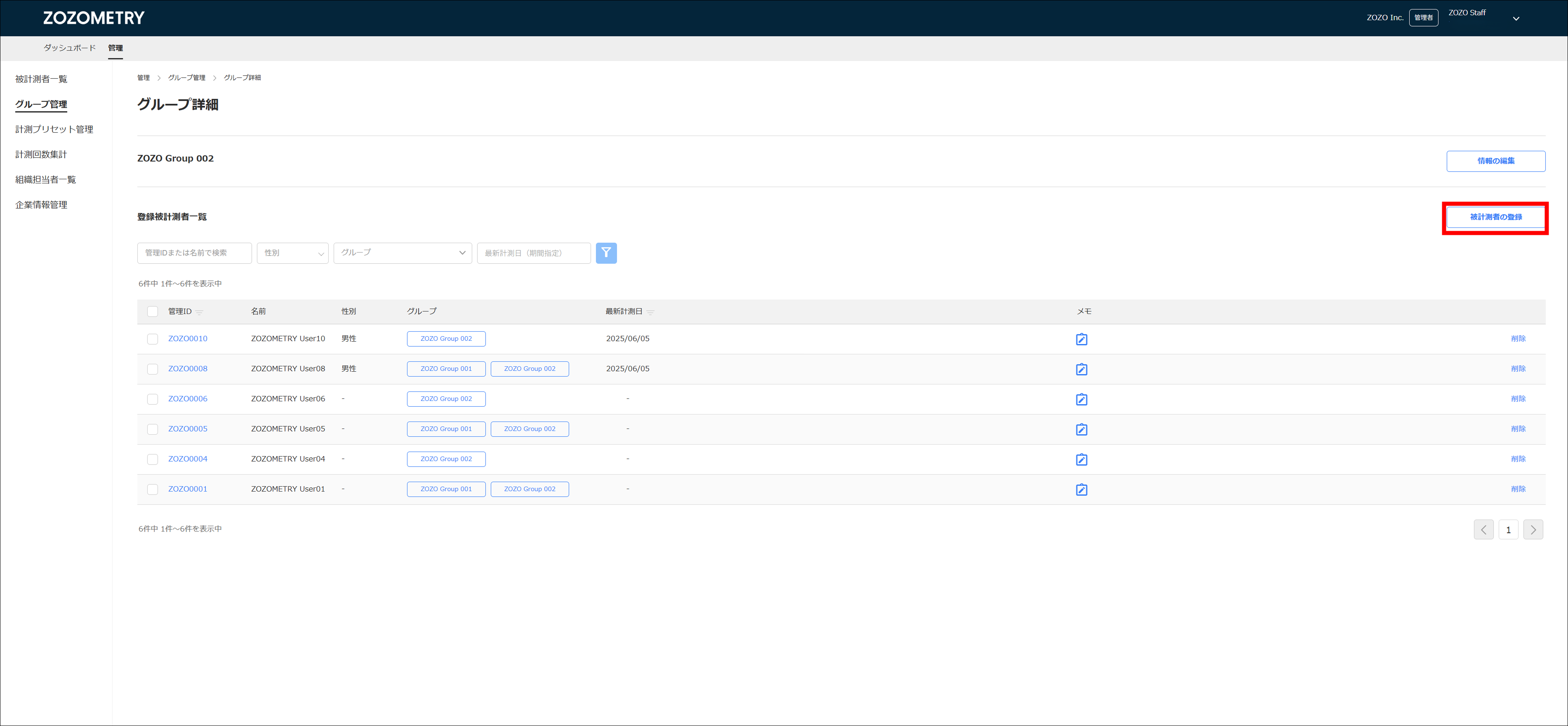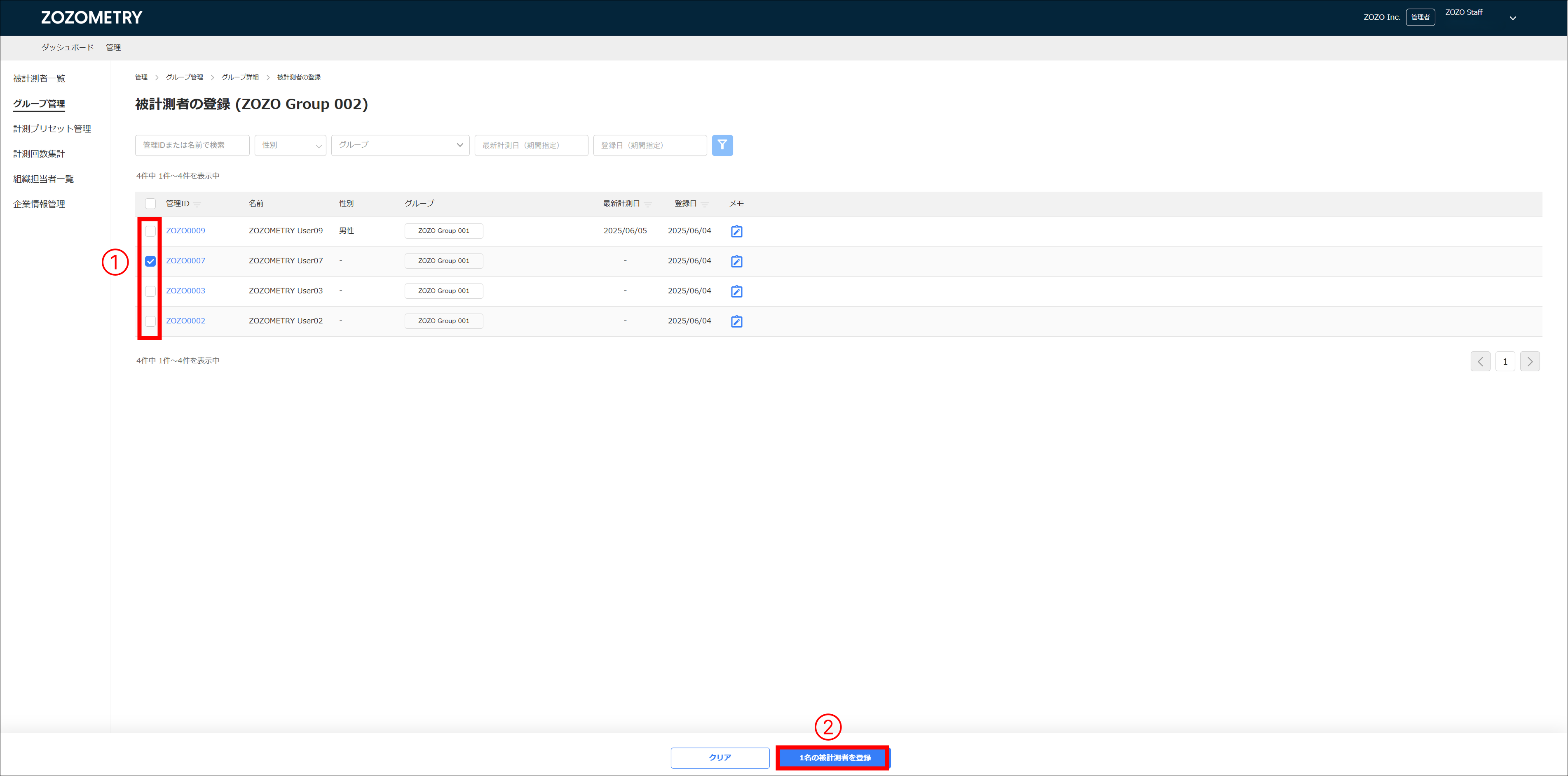 チェックを入れた後、「被計測者を登録」ボタンをクリックするとグループに被計測者が追加されます。