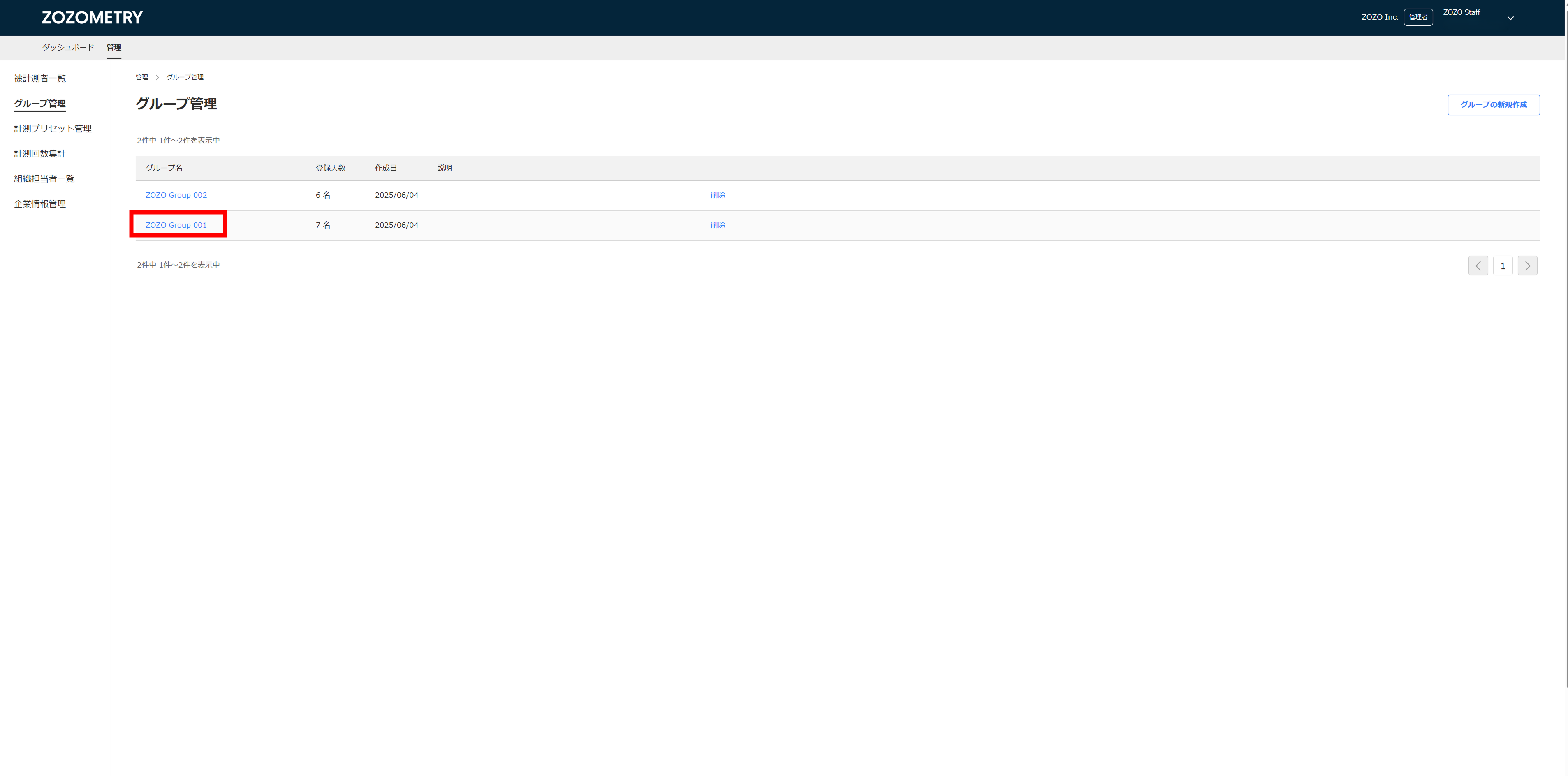 管理>グループ管理から作成したグループの一覧が確認できます。