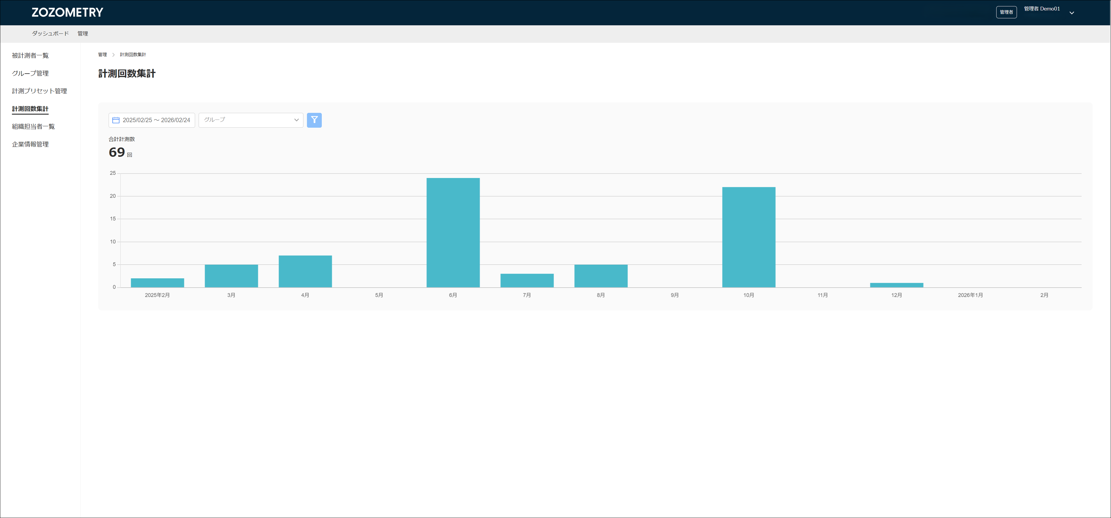 管理メニューより「計測回数集計」を選択すると、組織で行われた計測成功回数を確認できます。初期は最新12ヶ月分の回数が表示されます。